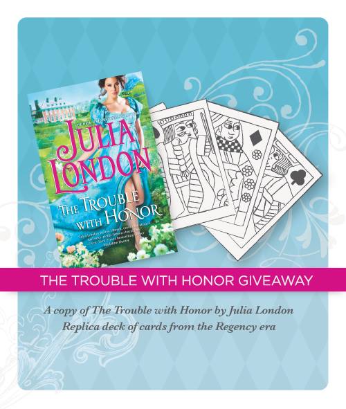 Thanks to Harlequin Books (whoo!) Traveling With T has a giveaway for you: A copy of THE TROUBLE WITH HONOR and Replica Deck of Playing Cards from Regency Era! Giveaway is open to US/Canada only!