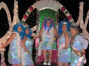 After a delightful morning of yummy food, meeting Hollywood royalty and getting my book signed- it time for some more shopping and then decorating our float for the parade. Once the work was over, though, the ladies in my group headed to eat at Que Sera Sera- and then some of us went back to hotel to start getting ready (it takes a long time to get in those dresses and get wigs, false eyelashes and crowns looking right- BUT, it is so fun!). The parade line-up began at 6, so we did not have much time to waste.