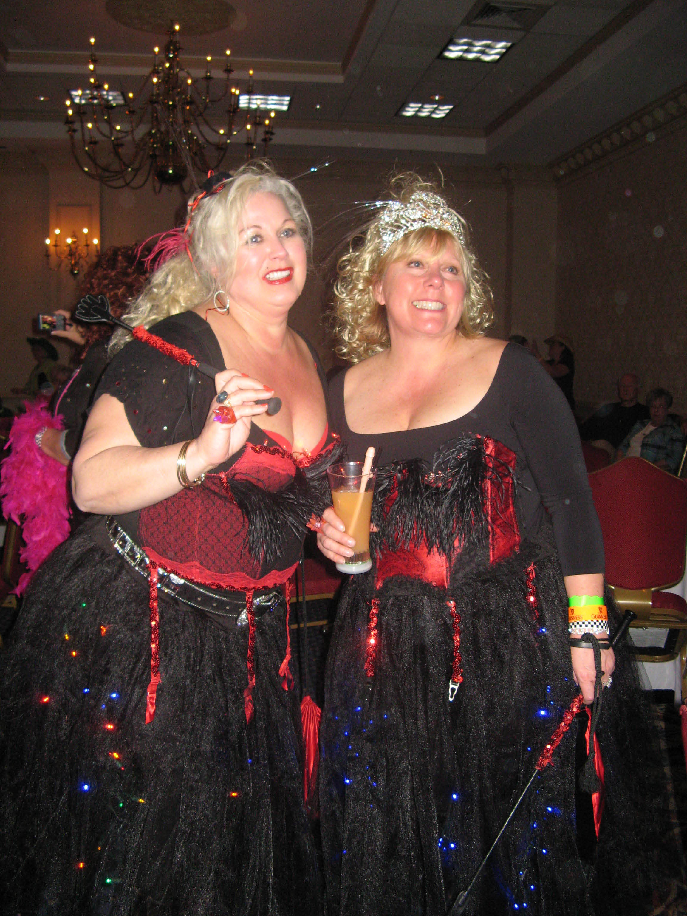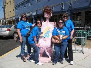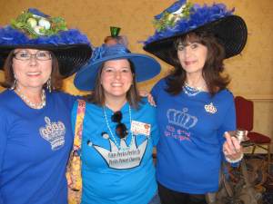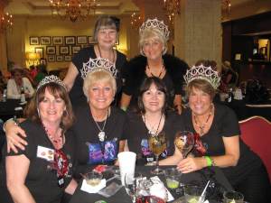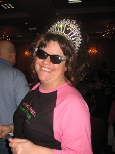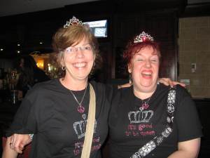 When I arrived in town on Thursday, I immediately saw a pile of women from last year- we all hugged and did the “Ahh! You’re here! What’s been going on?” thing. After unloading my car and taking my stuff to my room- I had to sit in the AC for a bit- it was HOT. Then I went and met up with some of the women- we stood around, talked, and made plans for dinner that night. 18 of us piled into Burger and Blues (a great little place to eat- good hamburgers, sweet potato fries, and and fun atmosphere.) Bless our server’s heart, he did not quit that night after setting 18 women wearing crowns and/or boas. We were a slightly loud crowd, but we were having fun and reuniting after a year of being apart. After eating till our heart was content (and everyone had a full belly) it was back to the Hilton for a night of bands and music. Several different bands played that night- and it was a blast hanging out with friends I see once a year and meeting new ladies!
