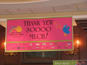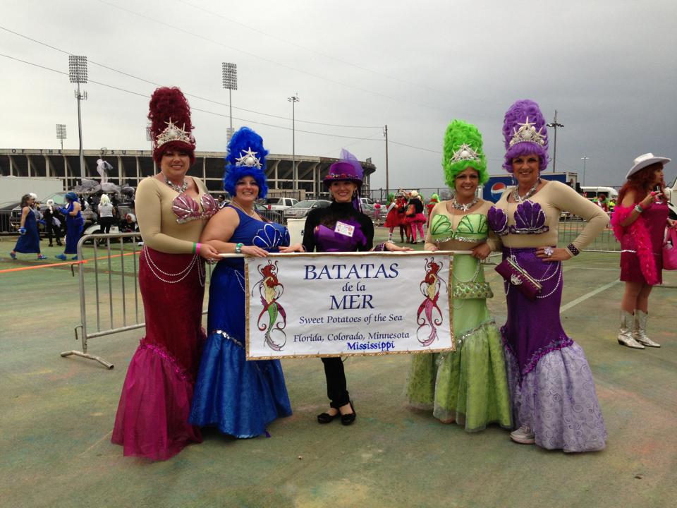 The parade is just something a person has to see to even believe. Tons of women, dressed up in various outfits, laughing and having a great time. People stopping us to take pictures. Beads flying through the air. Waving to friends. Seeing kids excited. And knowing that while you are having a good time, by doing this, the money you help raise is going to Blair E. Batson for the sick children who are there. After the parade is over, and the car has been given away- begin heading back to the cars and we see the Sweet Potato Queen Float. And they let us take a picture on the float. So cross that off the bucket list, folks- I have a pic of myself on the float, in the big chair. It’s a good night.